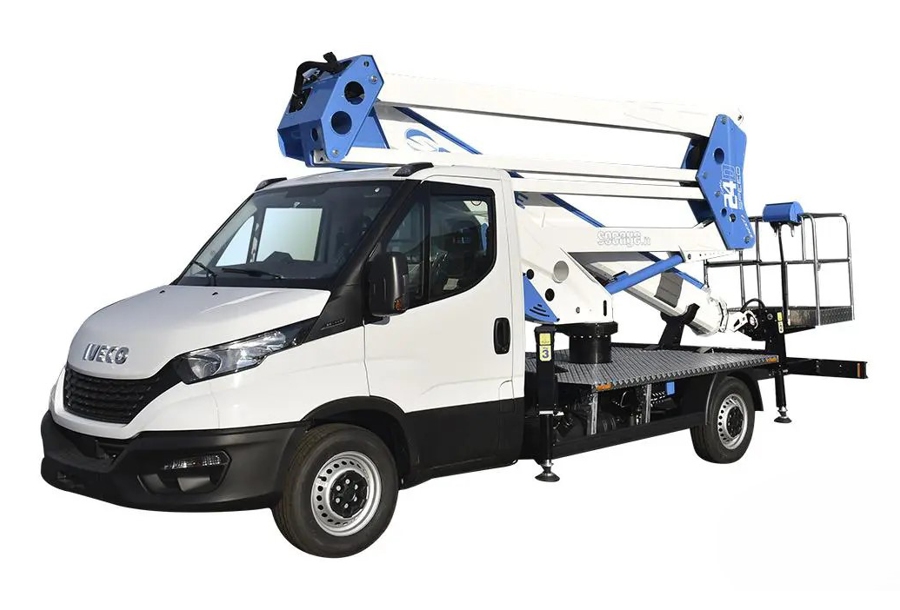 La Piattafomra 24D è in grado di raggiungere un’altezza di lavoro di 23,60 m e una distanza laterale di 12,70 m con una capacità di carico nel carrello di 230 kg o 300 kg come optional, (2 operatori + materiale).